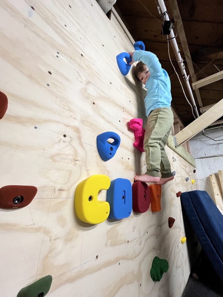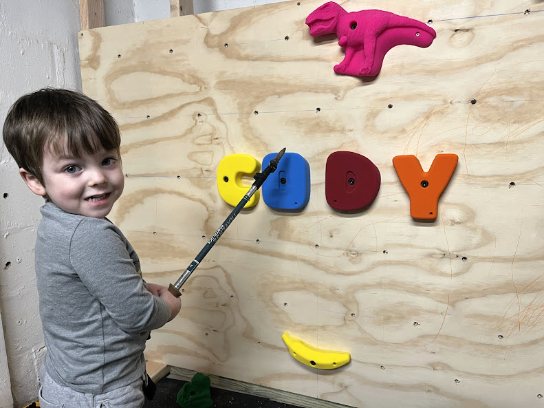 Once the first panels were on the wall, we could start adding holds! I revealed some very cute climbing holds that I ordered from Atomik Climing Holds - including some giant letters that spell Cody's name. He was very excited to help me decide where the holds should go (he called them "decorations"). We also hung a cowbell from the rafters - he really liked climbing up and ringing the bell at the top.