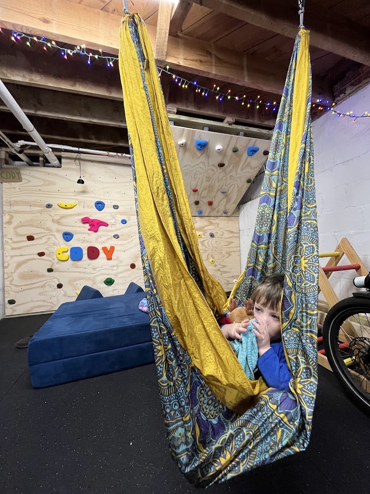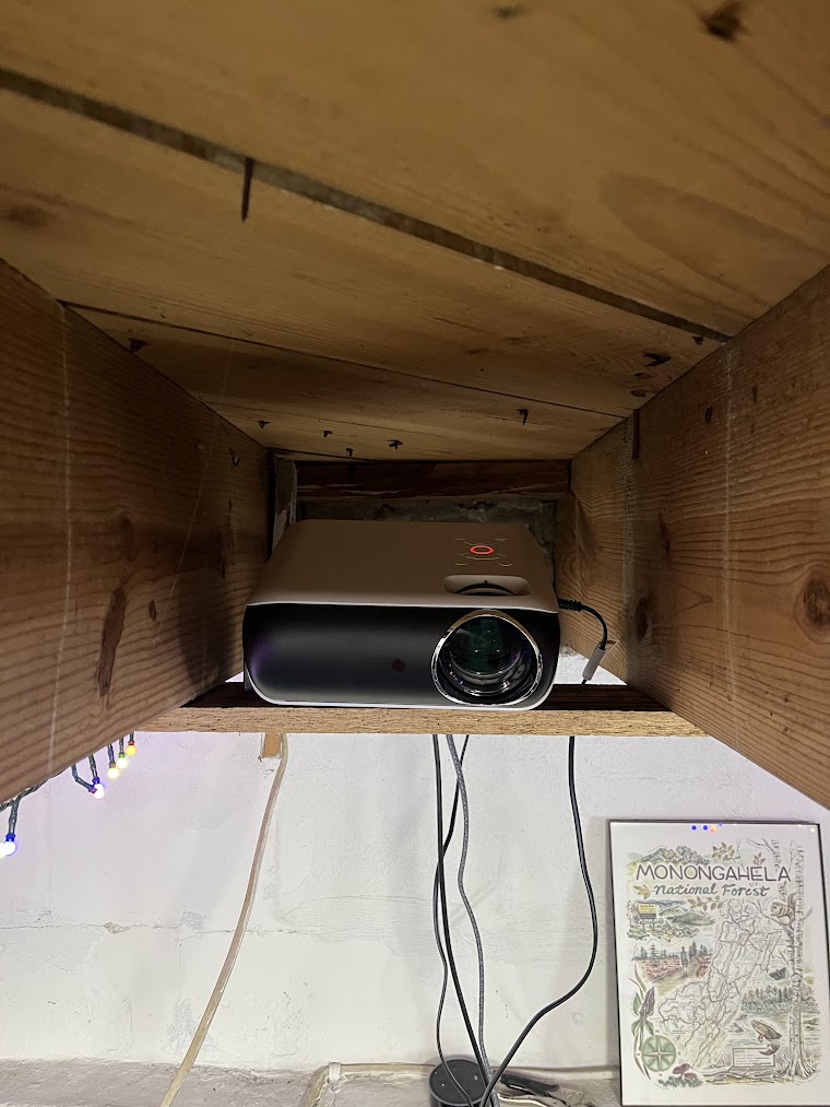 The final climbing wall is pretty compact, and I want the rest of the space to be flexible. I installed some porch swing hangers in the ceiling (secured with some huge lag bolts) - they are barely noticeable when we aren't using them, but make great attachment points when we want to relax in a hammock, or swing on gymnastics rings. We also tucked a projector up between the ceiling joists. When we took down our christmas tree in January, we put the christmas lights up on the ceiling. The result is a space where we can: