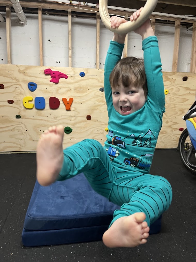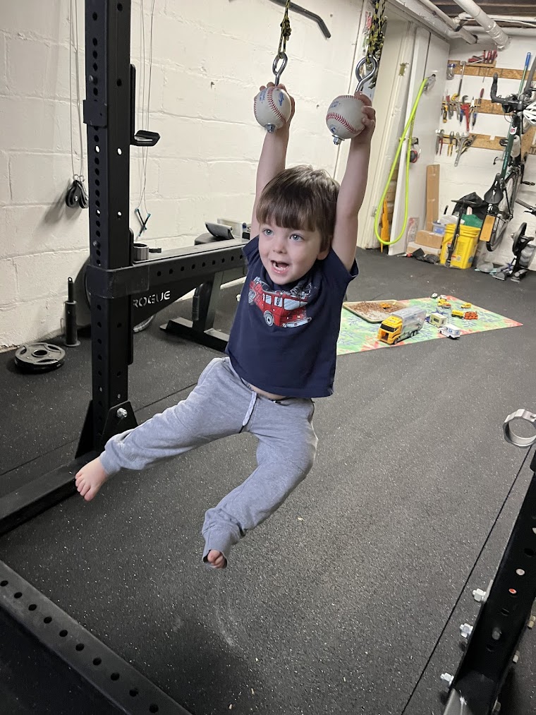I had a lot of big ideas going into this project, but I was very limited by the size of this one-car garage, and by the fact that we were living and playing in the space throughout the project. This is also my exercise space and our playroom, so I wanted to make sure that it was a usable space every step of the way, and that I could adapt to my son's interests. As an early experiment, I started letting my son play by hanging from the pull up bar that I already had. He loved playing on it and was asking for more, so I knew he would love what I had planned next.