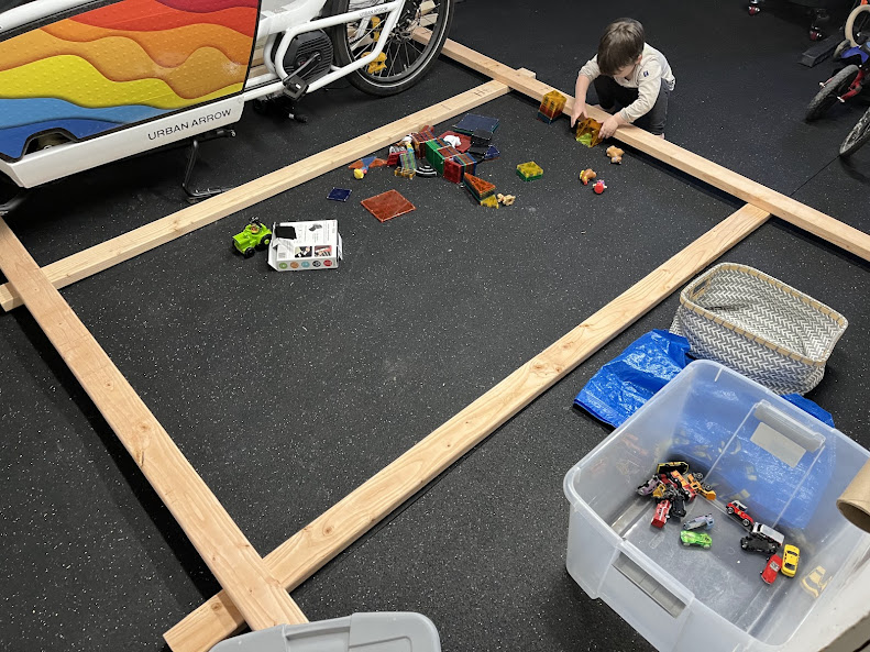 To help pass the time and channel my three-year-old's energy this winter, I've been working on turning my garage into a playroom. I'm really happy with how it's turned out! I put a ton of effort into researching and planning, so hopefully this post can help others who want to do something similar. I'll document my design and construction process, materials, and resources I consulted.