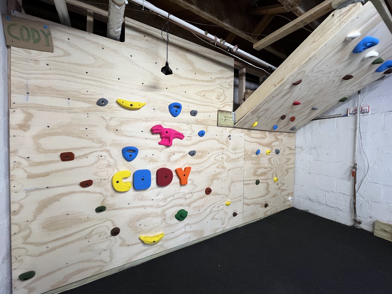 The wall is for me too! I wanted it to be something we could play on together, so I built an overhanging section for me. This is the traditional design for home climbing walls - when you don't have a lot of space, you compensate by building the wall on an angle to increase the difficulty. But constructing an overhanging wall is far trickier. I found a fantastic guide from Metolius Climbing: How to Build A Home Climbing Wall, which includes detailed descriptions of how to construct the overhanging wall safely, and which hardware to use. The best way to think of it is like a deck - instead of studs, you use beefy 2x8's with joist hangers on each end. I make sure the headers on each end were super strong (2x8's secured to the studs and to sleepers that spanned three ceiling joists each on the top). Every time I added a new part, I spent time hanging and bouncing on it, so I'm very confident that the final product is more than strong enough.